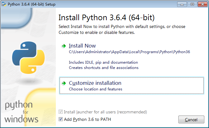 勾选Add Python 3.6 to PATH。选择Customize installation安装。