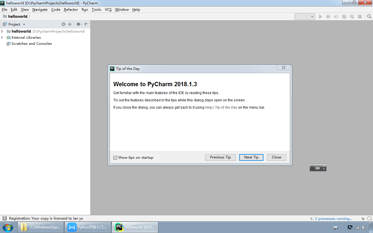 取消掉Tip of the Day对话框的Show tips on startup复选框,点Close。如果不取消复选框,则每次启动pycharm都会有这个对话框界面,它会提示一些软件使用上的小技巧。